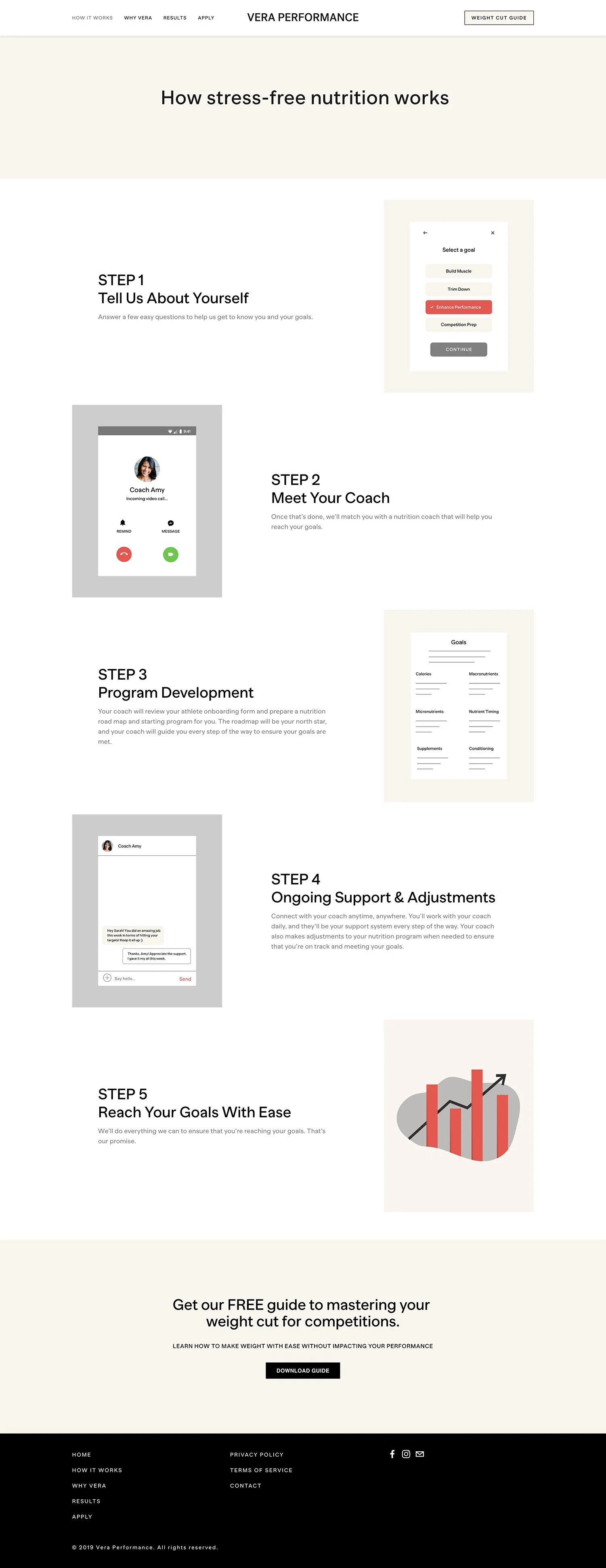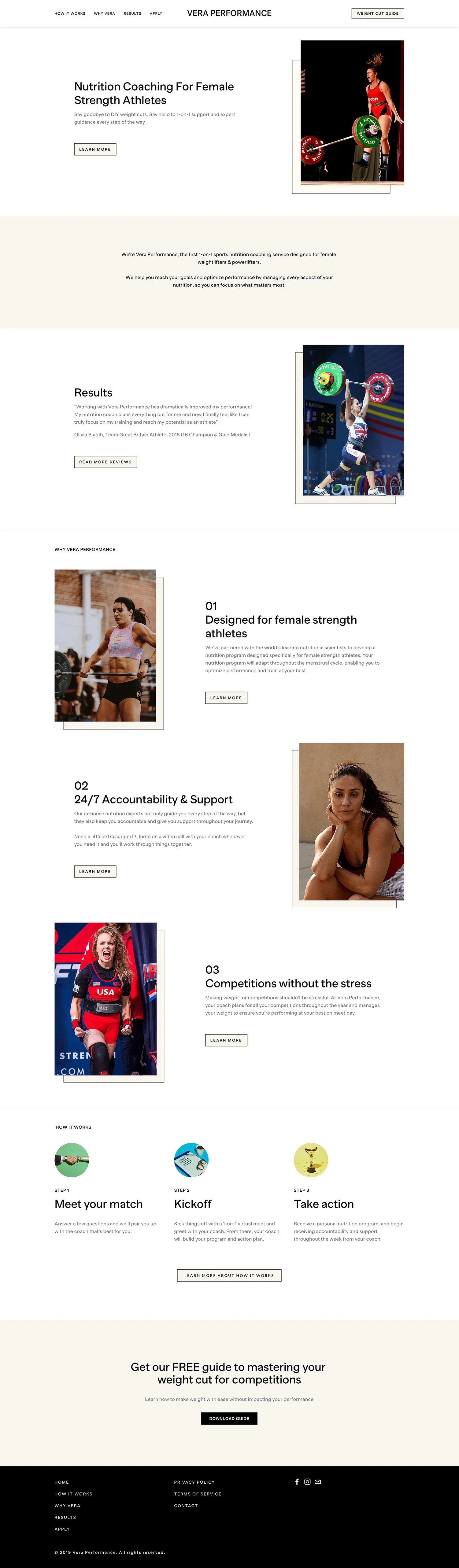 The Vera Performance site is largely informational, but we also incorporated a strong call-to-action in the form of timed pop-ups and incentives to encourage aspirational athletes to get in touch for more more information and start their journey towards the first-place podium.